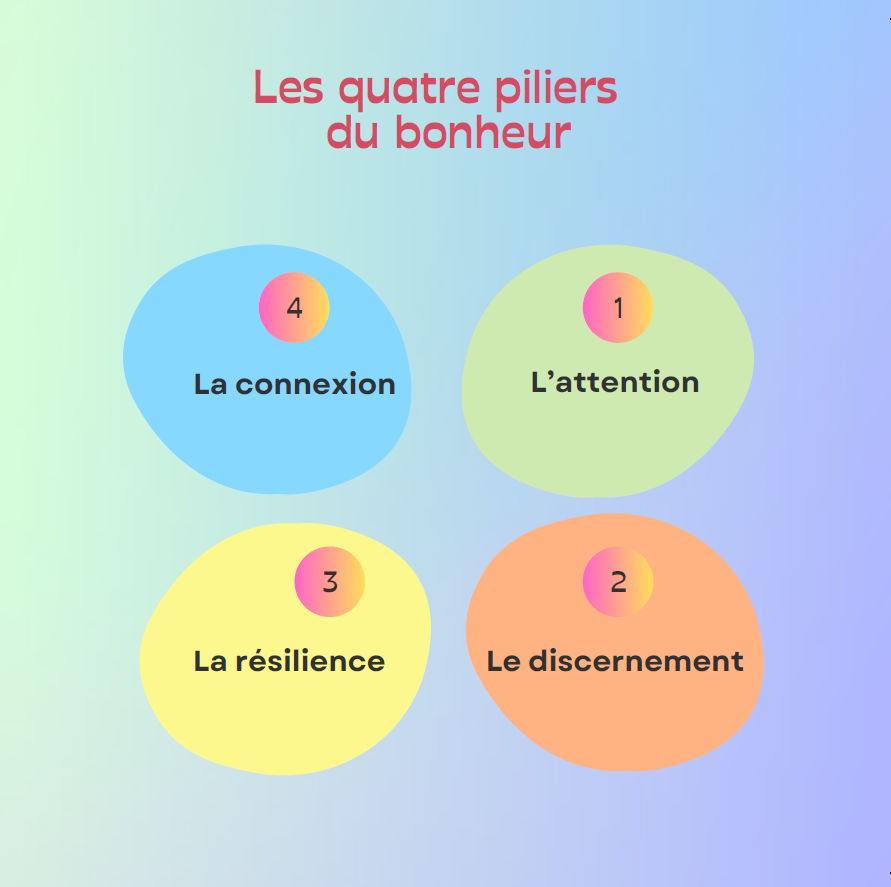 … Au travers des différentes approches, le programme permet de développer les 4 piliers du bien-être que sont l’attention, le discernement, la résilience et l’altruisme