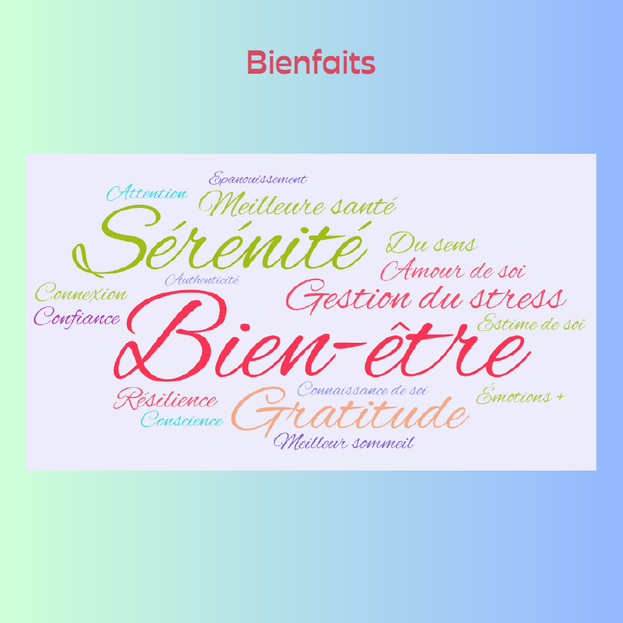 De nombreuses études scientifiques démontrent les effets positifs de la pleine présence sur la réduction du stress et le contrôle de l’anxiété, le développement de la santé émotionnelle, de la connaissance de soi, de la neuroplasticité, de la bienveillance et l’accroissement de l’attention, la réduction des pertes de mémoire liées à l’âge, l’amélioration du sommeil, du système immunitaire et de la pression artérielle ainsi que le contrôle de la douleur, …