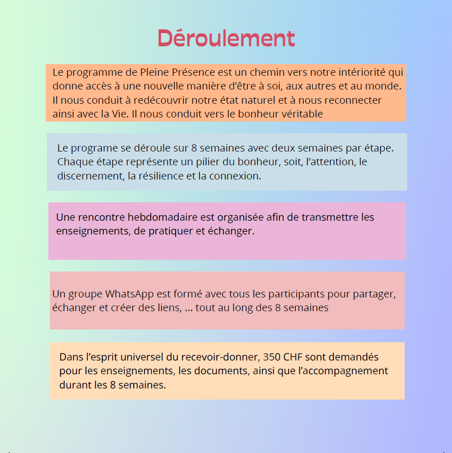 S’agissant autant d’une expérience personnelle que collective, il est nécessaire de s’engager à suivre l’entièreté du programme.